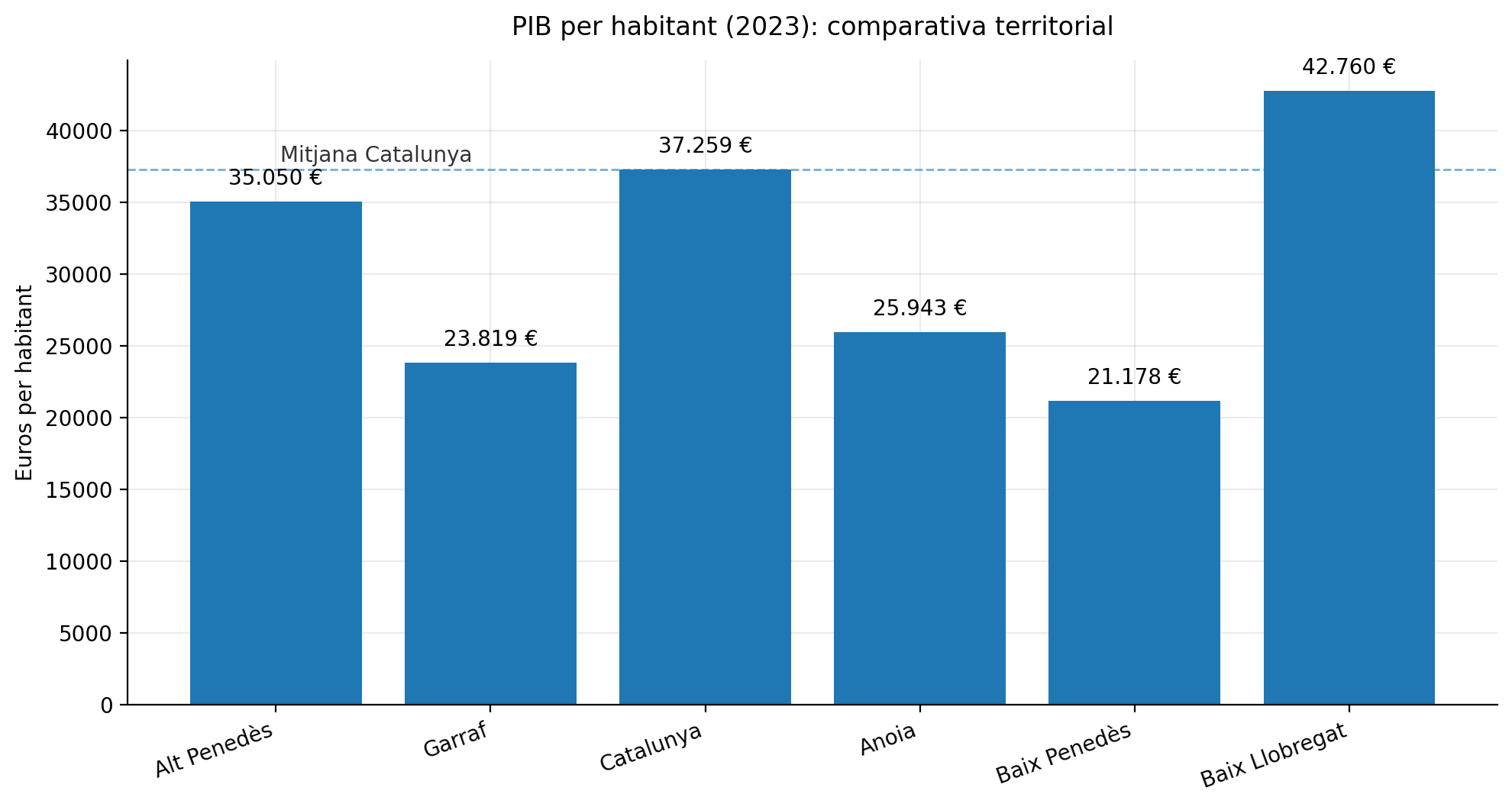 A l’Alt Penedès, el PIB per habitant es va situar en 35.050 euros, amb un increment anual del 8,46%, fet que va permetre a la comarca ascendir fins a la 15a posició del rànquing català, dues places més que l’any anterior. Tot i quedar lleugerament per sota de la mitjana catalana (37.259 €), el territori es va situar clarament per sobre de comarques properes com l’Anoia o el Baix Penedès.