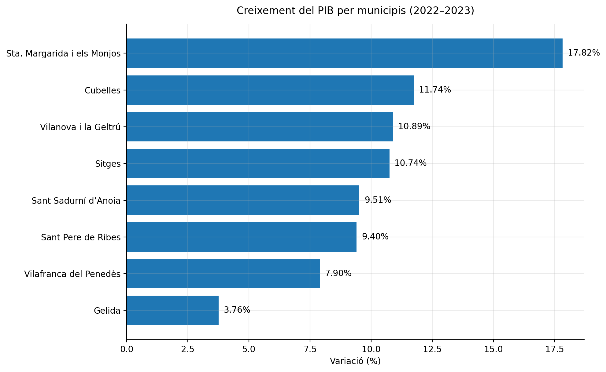 Les diferències municipals van ser especialment rellevants. A l’Alt Penedès, Santa Margarida i els Monjos es va consolidar com el principal pol econòmic, amb un creixement del PIB del 17,82% i un PIB per habitant de 75.019 euros, més del doble de la mitjana catalana.
