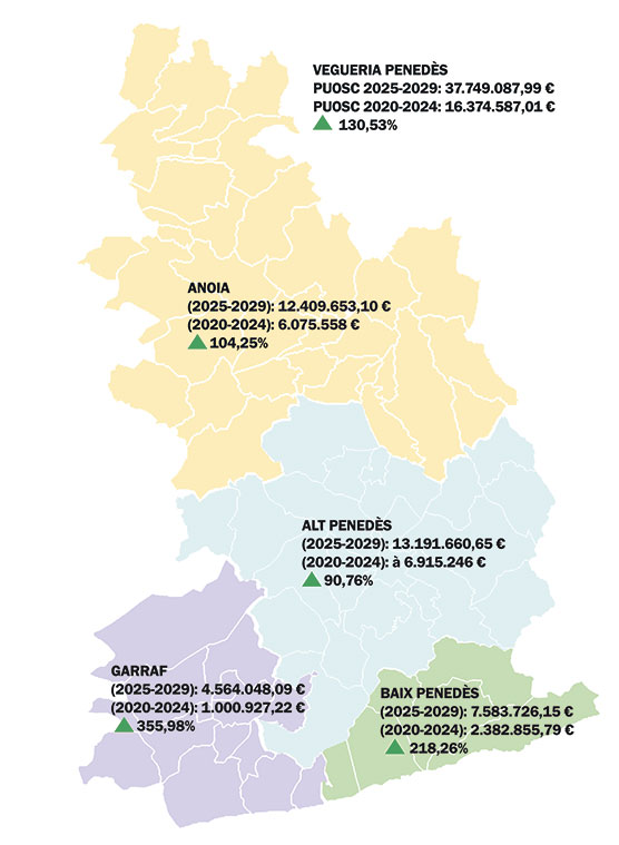 D’entre aquestes, les quatre capitals de comarca: Vilanova i la Geltrú, El Vendrell, Igualada i Vilafranca del Penedès rebran increments superiors al 480%, amb dotacions que passen dels aproximadament 130.000 euros de l’anterior pla als 789.900 euros actuals. En concret, la capital de l’Alt Penedès registra un augment del 485,11%, passant dels 135.000 euros establerts en el PUOSC 2020-2024 als 789.900 de l’actual. Pel que fa a Igualada, el seu increment econòmic és lleugerament més suau (481,69%), saltant dels 135.795 euros pressupostats en l’anterior pla als 789.900 euros, mateixa quantia que la resta de capitals de la vegueria.